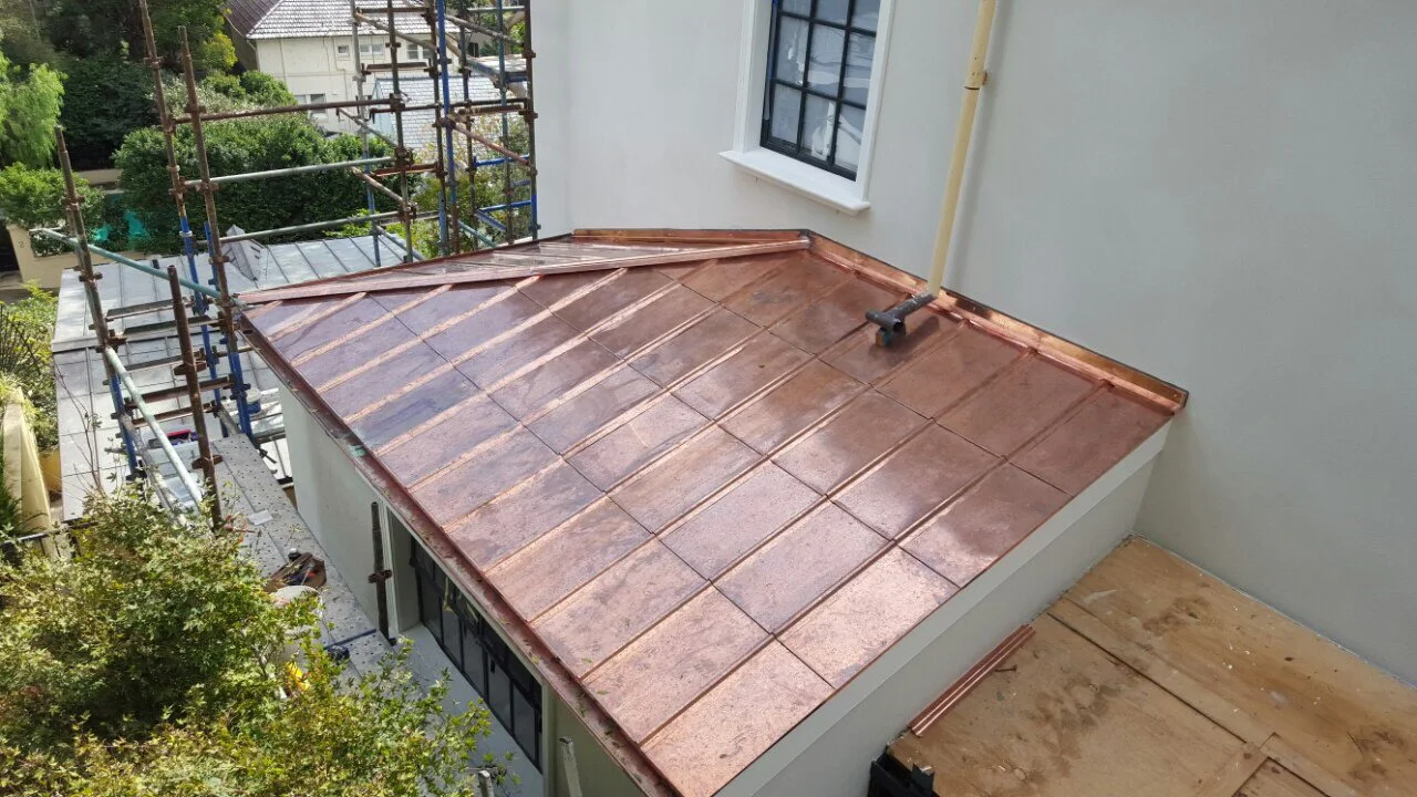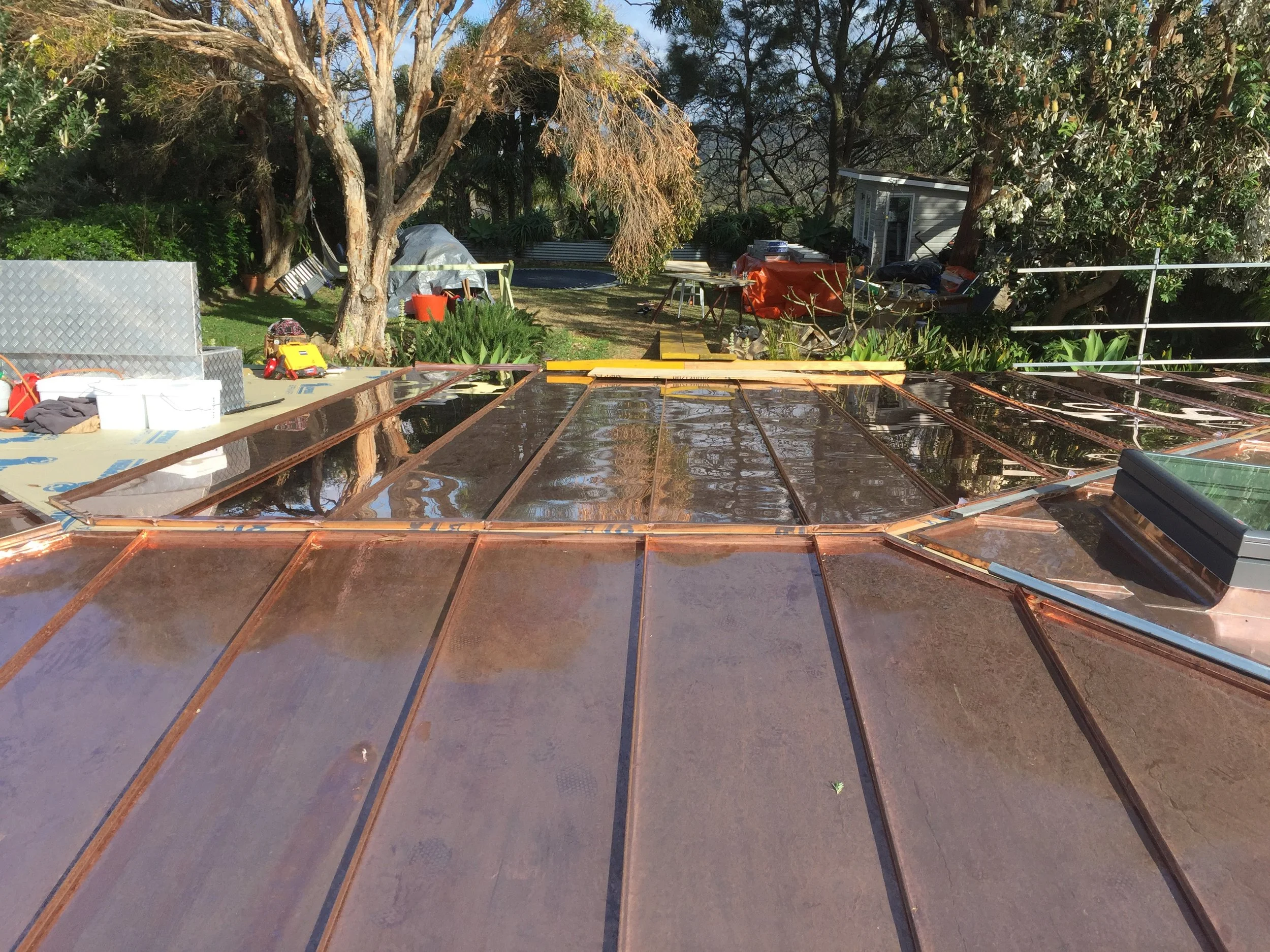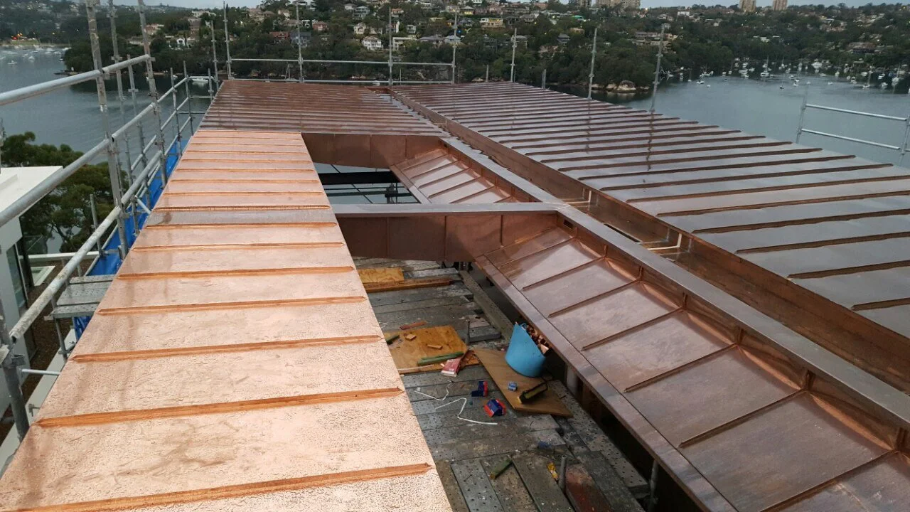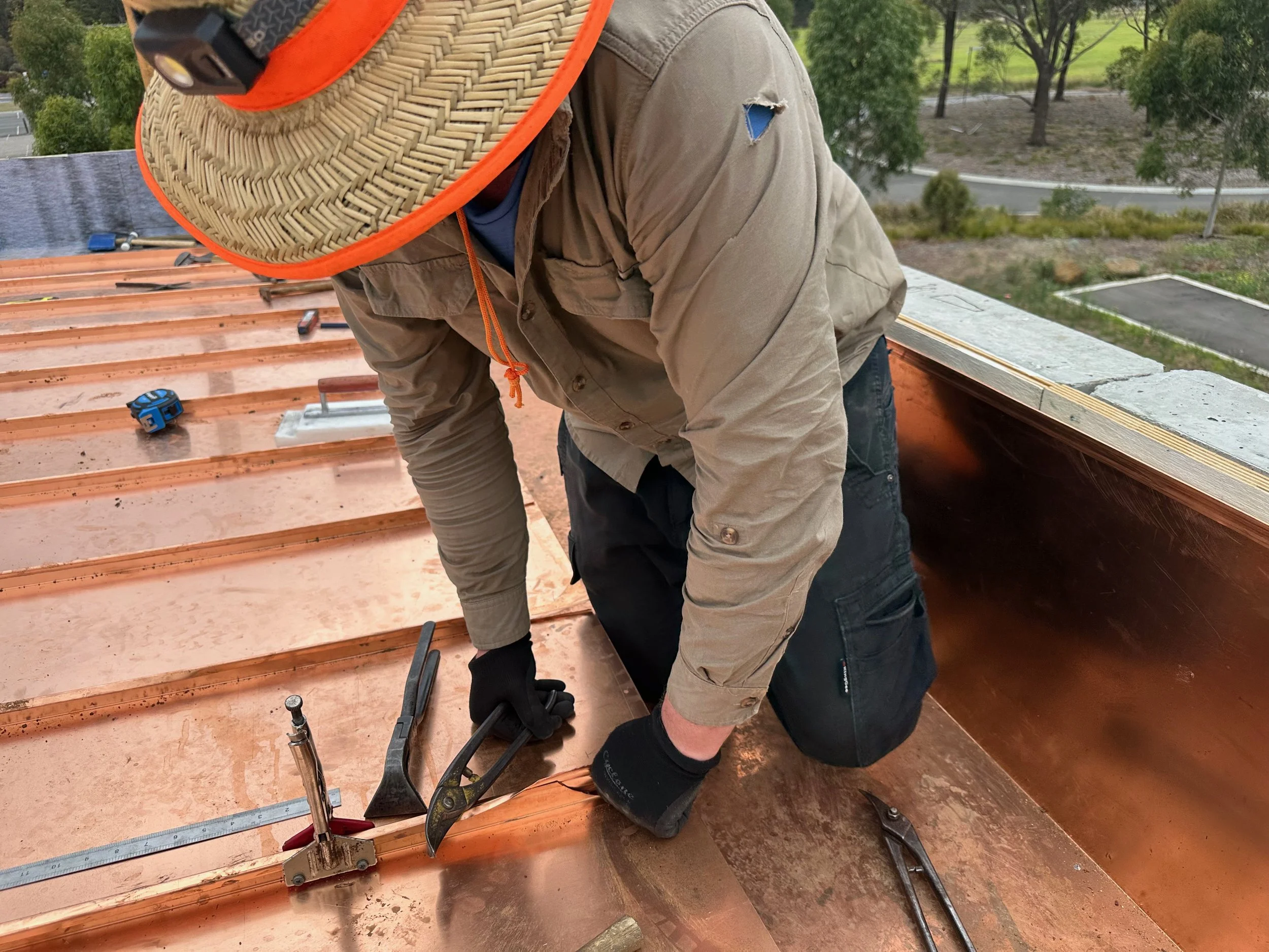 Roof installer working on copper standing seam roof in Sydney, Australia